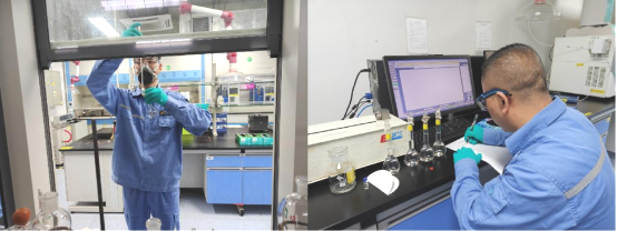比賽于9月12日正式拉開帷幕。賽前,大家仔細檢查硫分析儀的運行狀態、核對標準溶液的有效期,不放過任何細節;“計時開始”的指令下達后,全場瞬間進入“靜音競技模式”。選手們屏氣凝神,手持移液管精準取液,目光緊盯刻度線確保無一滴偏差;在容量瓶定容時,小心翼翼控制滴管滴速,反復確認凹液面與刻度線齊平。整個過程緊湊流暢,選手們動作嫻熟卻不倉促,每一次操作后的復核,都彰顯著宇新化驗人對“數據精準”的執著追求。