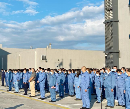 7點(diǎn)35分,旭日初升,宇新股份、宇新化工、宇新新材、博科新材全體員工統(tǒng)一著工裝,迎著朝陽,精神抖擻地列隊(duì)集合。7點(diǎn)40分,周總宣布升旗儀式開始,旗手和護(hù)旗手們邁著整齊有力的腳步,護(hù)著旗幟入場。伴著雄壯的《義勇軍進(jìn)行曲》響起,五星紅旗冉冉升起,全體員工行注目禮,莊嚴(yán)肅穆。