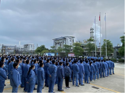 7點35分,全體員工在宇新化工辦公樓前坪列隊集合。7點40分,譚書記宣布升旗儀式正式開始,旗手們著裝統一,戴白手套,邁著鏗鏘有力的步伐,護著五星紅旗入場。伴著雄壯的《義勇軍進行曲》響起,國旗冉冉升起,全體員工行注目禮,莊嚴肅穆。